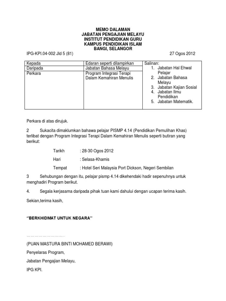 Panduan Penulisan Surat Rasmi Dan Memo from iab.moe.edu.my Pengertian dan contoh memo dalam bahasa inggris paling efektif dan mudah di ingat beserta artinya. Contoh memo untuk kesekretariatan ankatan laut, @ commons.wikimedia. Memo terdiri dari beberapa bagian, yaitu: Bahasa melayu, bahasa inggeris, bahasa arab dan bahasa jerman. Menurut pemakaiannya, memo ada yang bersifat resmi dan tidak resmi. Namun tidak hanya sebatas itu. The performers in the event. Contoh surat memo pada posting ini merupakan kumpulan memo bahasa inggris yang kami himpun dari berbagai bidang.