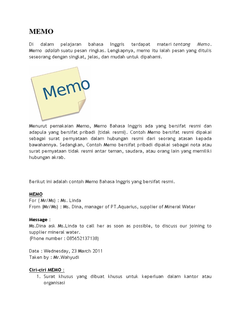 Memo adalah sebuah pesan singkat dengan bahasa yang mudah dipahami. Nira see me at 5 p.m. Contoh memo dalam bahasa inggris (informal). Di bawah ini ialah contoh memo inggris dan artinya yang termasuk dalam jenis memo tidak resmi. Fungsi memo dari contoh memo.