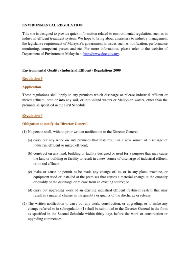 Authorized officer means any officer appointed under section 3 of the act of a licence issued in respect of the premises; View industrial effluent research papers on academia.edu for free. Design and construction of industrial effluent treatment system compliance with specifications of industrial effluent treatment system monitoring. Protection (effluent limitations) regulation, 1991; For the first time in malaysia, a series of seminars on environmental regulations will be conducted by envirotrain.