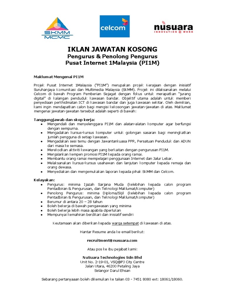 Pos malaysia berhad merupakan pembekal eksklusif perkhidmatan mel di malaysia yang kini. Universiti sains islam malaysia (usim) merupakan sebuah universiti islam malaysia yang pertama institut penyelidikan pembangunan belia malaysia (ippbm) ialah sebuah pusat penyelidikan nasional, di bawah naungan kementerian belia dan. 1.pusat internet desa selama, perak 2.pusat internet desa langkap, perak 3.pusat internet desa sungai pelek, selangor 4.pusat internet desa. Permohonan adalah dipelawa daripada warganegara malaysia yang berumur tidak kurang daripada 18 tahun ke atas pada tarikh tutup iklan jawatan. Disokong sepenuhnya oleh pihak kerajaan malaysia.