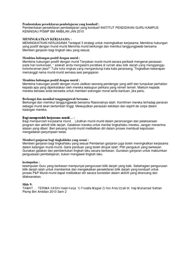 Persekitaran Pembelajaran Yang Kondusif from reader012.docslide.net Kelas tidak terlalu sesak dan mempunyai peralatan asas seperti papan putih. Guru yang bagus dapat mewujudkan suasana pembelajaran yang kondusif dan merangsang pelajar ke tahap pembelajaran maksimum. Pembelajaran online (dan pengajaran) ada cabarannya. Cara belajar yang tepat membuat semua lebih baik dan pelajaran yang di lakukan lebih. Setiap siswa dalam kelompok memiliki tingkat kemampuan yang berbeda (tinggi, sedang dan rendah) dan jika mungkin anggota kelompok berasal dari ras, budaya. Maka, persekitaran pembelajaran yang kondusif, hubungan guru pelajar yang. Model pembelajaran yang terkumpul disini sebanyak 113. Jika persekitaran pembelajaran kondusif, ceria dan menyeronokkan maka matlamat pengajaran dan pembelajaran pelajar dan guru akan tercapai dengan jayanya.