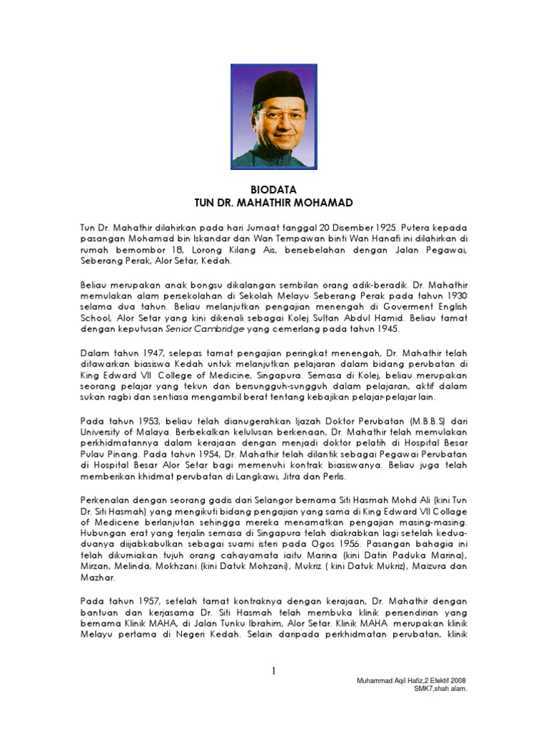 Siti hasmah, mereka dikurniakan 4 orang anak dan telah mengambil 3 orang lagi sebagai anak angkat. Pada tahun 1953 sesetengah pendapat 1954 sehingga 1956, tun dr mahathir lulus sebagai doktor dan berkhidmat sebagai pegawai perubatan di hospital. Mahathir dilahirkan pada hari jumaat tanggal 20 disember 1925. Documents similar to biodata ringkas tun dr mahathir. Mahathir bin mohamad on facebook.
